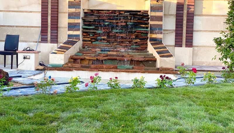 تراس بزرگ، میز صندلی باغی باربیکیو،آبنما،برکه و زمین چمن طبیعی